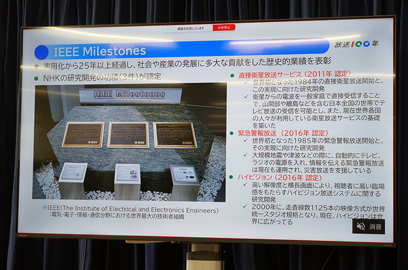 IEEEでは「実用化から25年以上経過し、社会や産業の発展に貢献した歴史的業績」を表彰する取り組みを実施している。この取り組みのなかで、NHKが研究開発した「直接衛星放送サービス」「緊急警報放送」「ハイビジョン」という3つの技術が認定・表彰された実績があることが紹介された。