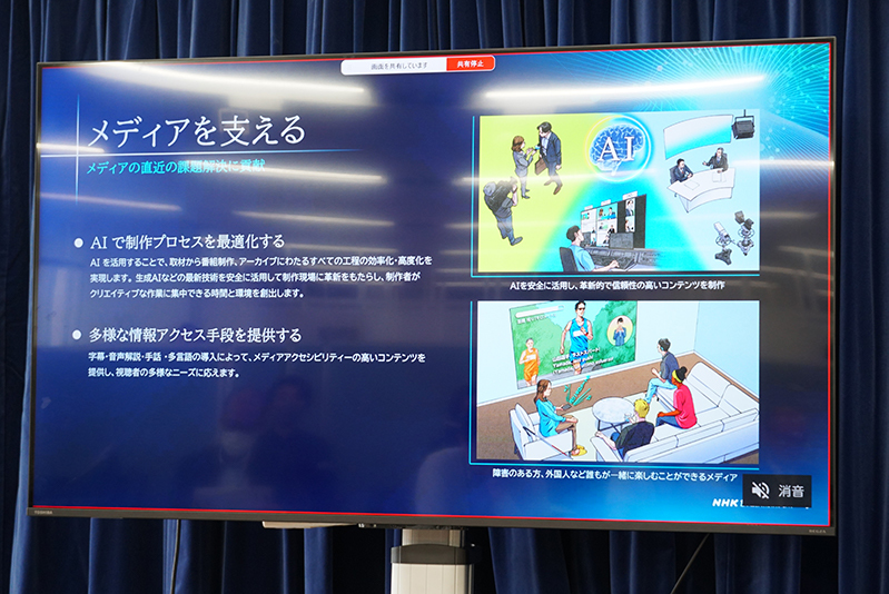 さらにこの3つの柱に加えて、「メディアを支える」をもう1つ重要な柱として掲げている。これは、将来のメディア構想のみならず、直近のメディアにおける課題解決を実現する研究開発の取り組みを指し、主にはAIを活用することで取材から番組制作、アーカイブにわたるすべての工程の効率化・高度化を実現するものだとアピールした。