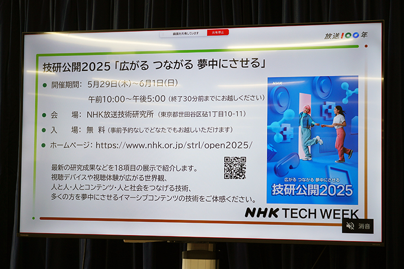 NHKは5月末から6月頭にかけて、NHKの技術イベント施策「NHK TECH WEEK」を展開。その1つとして、毎年恒例の様々な技術を一般に披露するイベント「技研公開2025」を、5月29日(木)から6月1日(日)にわたってNHK放送技術研究所で開催する。