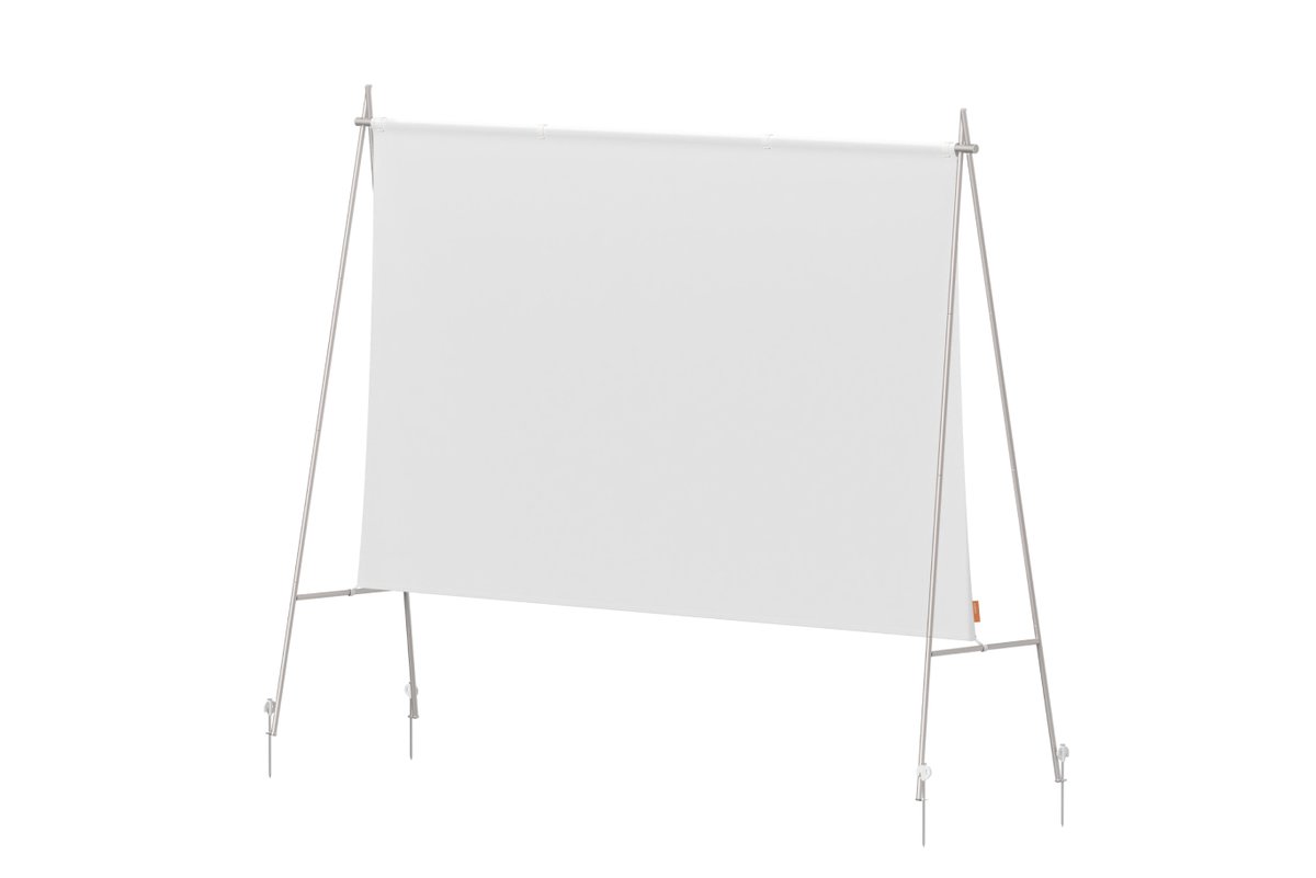 スクリーンを立てる骨組みには航空機レベルのアルミ素材を使用したことで、軽量かつ防錆仕様であることが特徴だという。また、支柱四隅には高強度のペグが導入されているため、設置する際の安定性・安全性を確保している。スクリーンを広げた際の外形寸法は1760W×1372H×431Dmm、質量は1.5kg。専用の収納ケースが付属しているため持ち運びやすい仕様となっている。