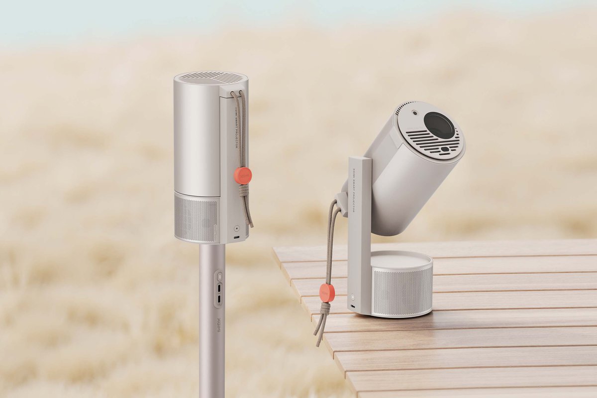 コンパクトプロジェクター「MoGo 3 Pro」は、投写角度を130°調整できるスタンドが一体型となったモデルであり、フルHD解像度、450ルーメン(ISO)に対応。Harman Kardonスピーカーを内蔵し、音質にもこだわったとする。バッテリー付きスタンドを組み合わせることで、屋外でも使用できる。