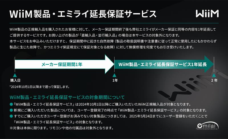 WiiM製品の正規輸入品を購入したユーザーへ対して、メーカー保証期間終了後も同社がメーカー保証と同等の内容を1年延長して提供するもの。サービスに申し込むことで、保証期間中に起きた自然故障(製品の取扱説明書や注意書に従って正常に使用したにもかかわらず製品に生じた故障で、かつエミライ保証規定にて保証対象となる故障)に対し、無償修理を何度でも行うことができると同社は説明する。