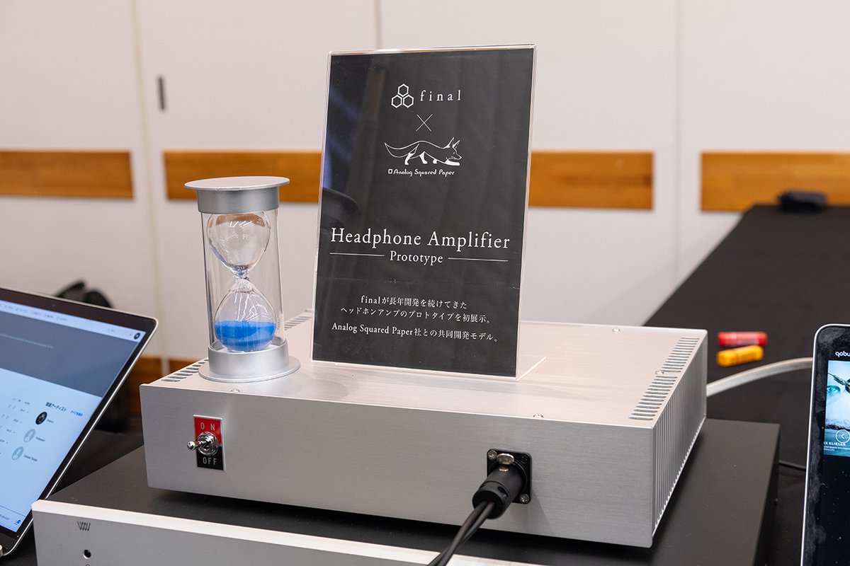 さらにfinalとしては初のアンプ製品も参考出展。Analog Squared Paperとの共同開発機だそうだが、詳細は現時点で一切が不明。まずはブラックボックスというかたちでファンの方々に聴いてもらい、リアクションを見つつ開発を進めていくとのこと。