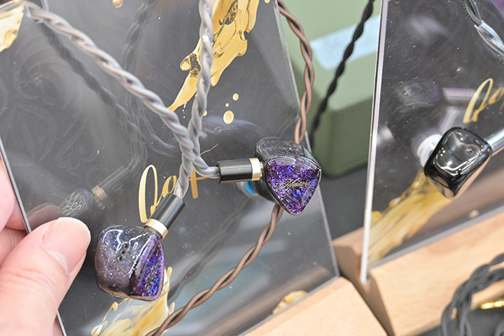 このほか、QoAからはダイナミック1基/BA4基/BC(骨伝導)1基を搭載したフラグシップモデル「Martini(マティーニ)」が展示。フェイスプレートだけでなくシェルにまでラメを振りまいた華やかなデザインも特徴的で、5月から6月ごろに国内でも発売できるという。その後に発売予定のダイナミック1基/BA2基/平面型2基搭載「Bijou(ビジュー)」も参考出展されていた。