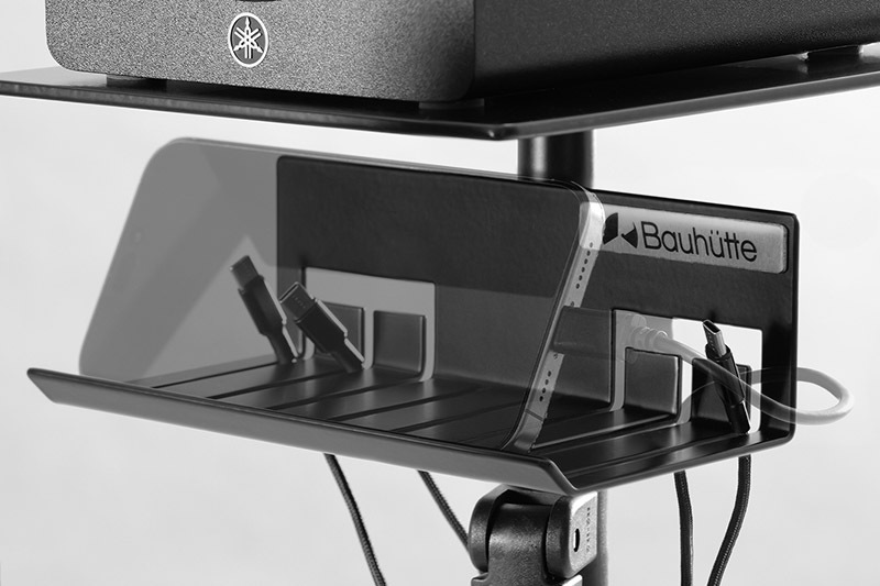 ほか、スタンドの片側にはアンプラックを搭載。小型アンプやスマートフォン、デスク上で散らばりがちな小物などをまとめて置いたり、切り欠きにケーブル類を引っ掛けて配線整理に使うことが可能。なおアンプラックを使用する場合、支柱の高さ調整幅は22 - 26cmとなる。