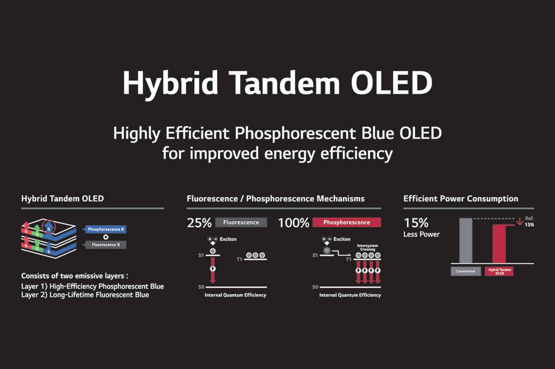 「ハイブリッドツースタックダンデム構造」は、蛍光方式のメリットである安定性とリン光方式の特長である低電力を兼ね備えており、既存の有機ELパネルの安定性レベルを維持しながら、電力消費量を15%削減できたという。