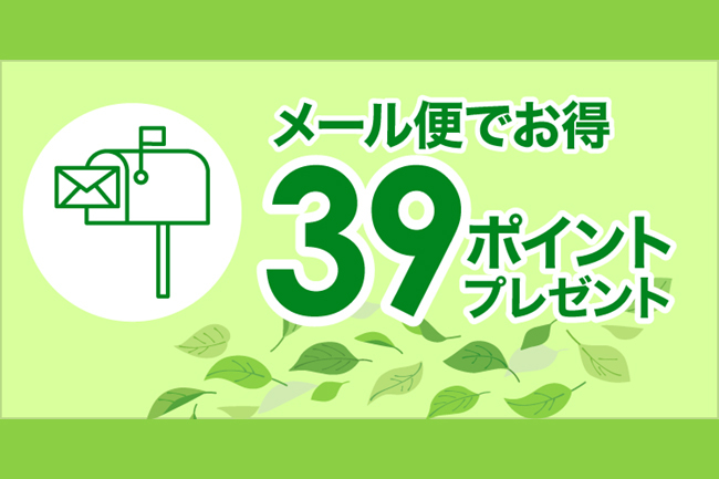 期間限定でメール便を利用することによって、再配達の削減/CO2排出量の削減の貢献に繋がる買い物をされた購入者を対象に、39ポイント(サンキュー)をプレゼントするもの。期間中に注文した商品のお届け方法に「メール便」を指定することが対象条件となっており、対象配送1件につき39ポイントが商品お届け月の翌月末までに付与される。商品価格が税込100円未満の配送に対しては5ポイントの付与となる。