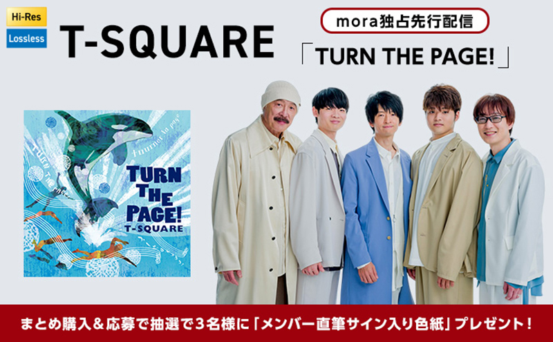 さらに配信記念として、moraでは対象期間中にT-SQUARE「TURN THE PAGE!」をまとめ購入&応募した方の中から、抽選で3名様に「メンバー全員の直筆サイン入り色紙」がプレゼントされる。