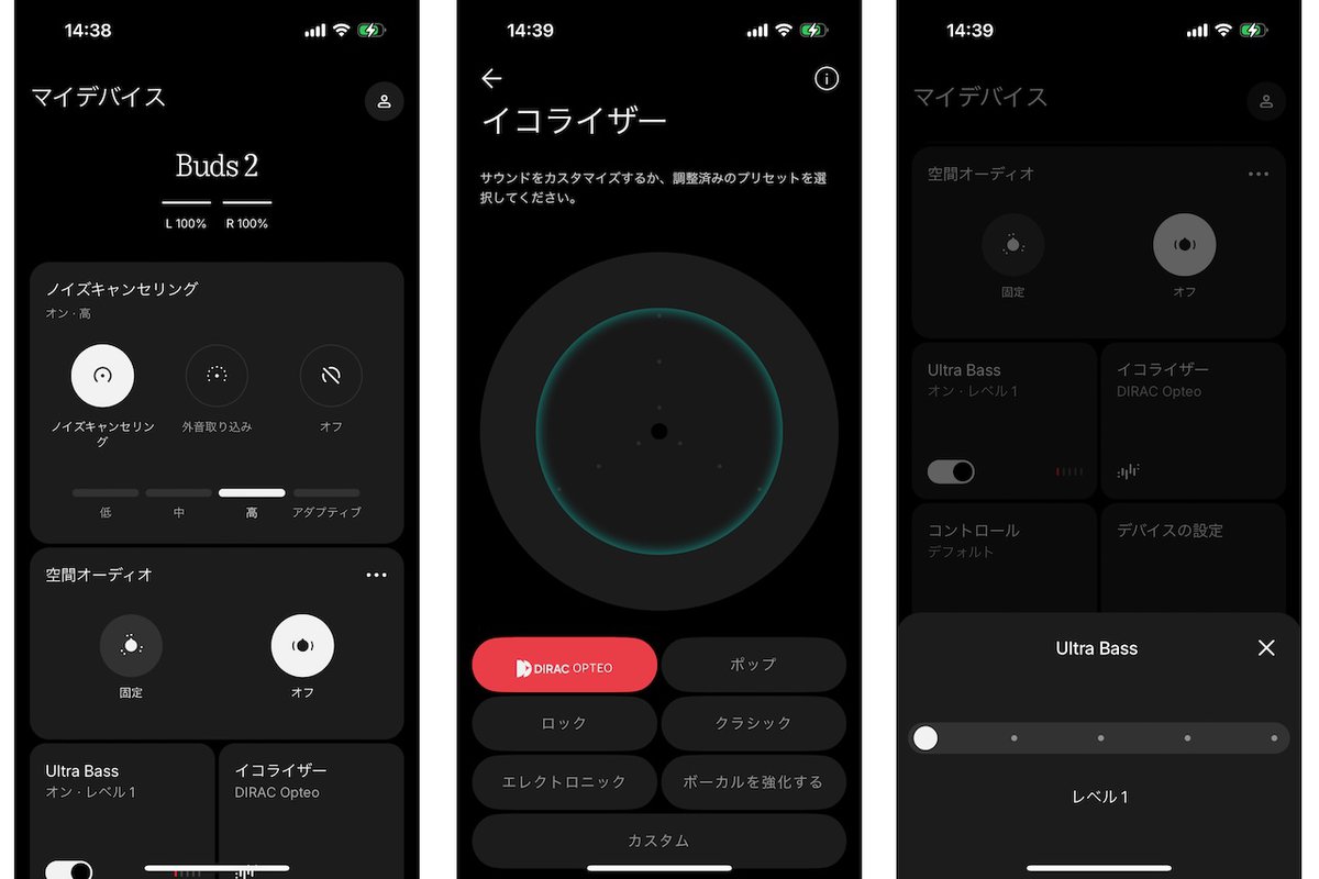 音響面では、合理的に突き詰めた結果として11mm PMF製ダイヤフラム搭載のダイナミックドライバーを採用。高音質技術としてDirac社のチューニングによる「Dirac Opteo」イコライザーモードや、独自の空間オーディオエフェクト、5段階で調節可能な「Ultra Bass Technology 2.0」なども搭載。