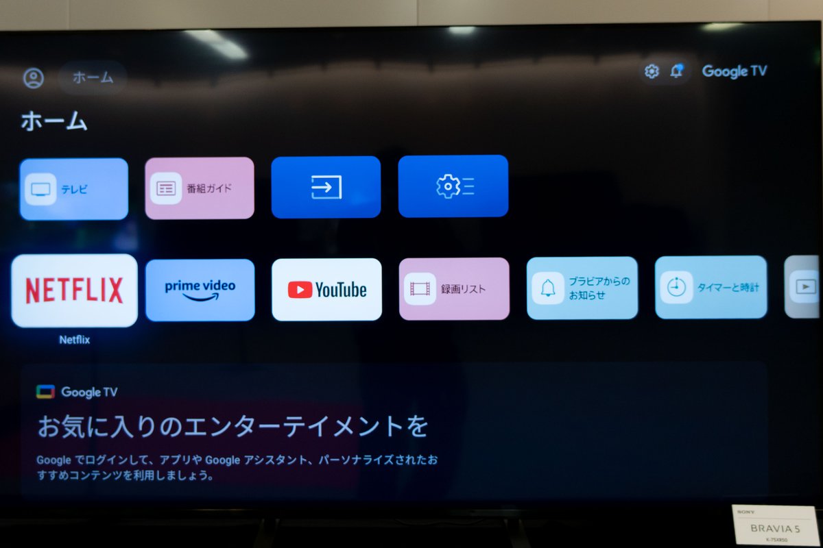 OSはGoogle TVを採用。YouTube/Prime Video/Netflix/Disney+/Apple TV/U-NEXT/TVer/ABEMA/hulu/DAZN/FODといった豊富なVODサービスが手軽に楽しめるようになっている。