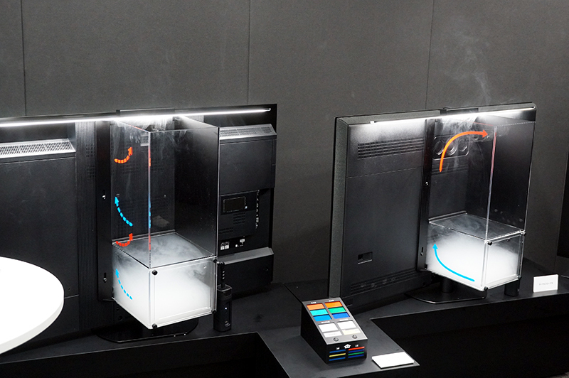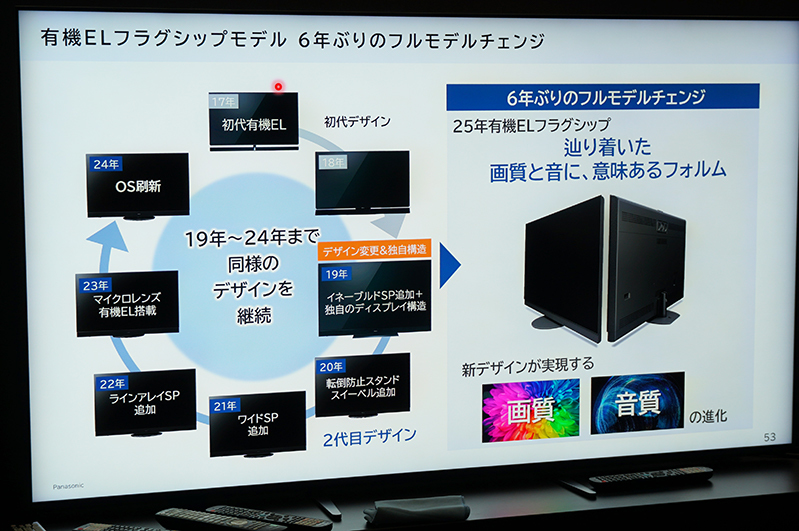 ほかデザイン面では、レイヤー構造によって薄く見せるフルフラット薄型デザインを採用し、本体最厚部は前年の69mmから52mmまで縮小。ミニマルな佇まいや壁掛け時の奥行を縮小したという。