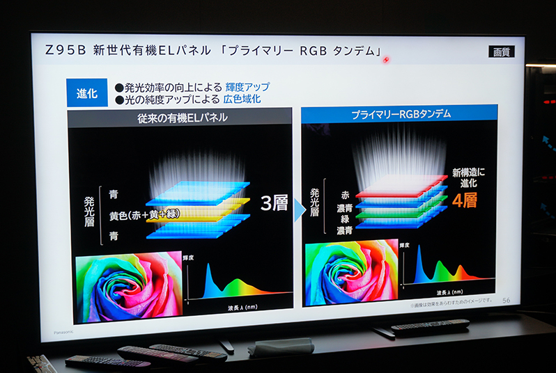 従来の有機パネルでは、発光層が青、黄色(赤+黄+緑)、青の3層構造だったのに対し、今回のプライマリーRGBタンデムでは発光層が赤、濃青、緑、濃青の独立した3色に分かれた4層の新構造を採用。加えて最新の青色の発光層採用により光の波長を最適化したことで、発光効率の向上による輝度とコントラストの向上、そして光の純度アップによる広色域化を実現し、「前世代機からもう1段階ステップアップした画質を実現した」という。