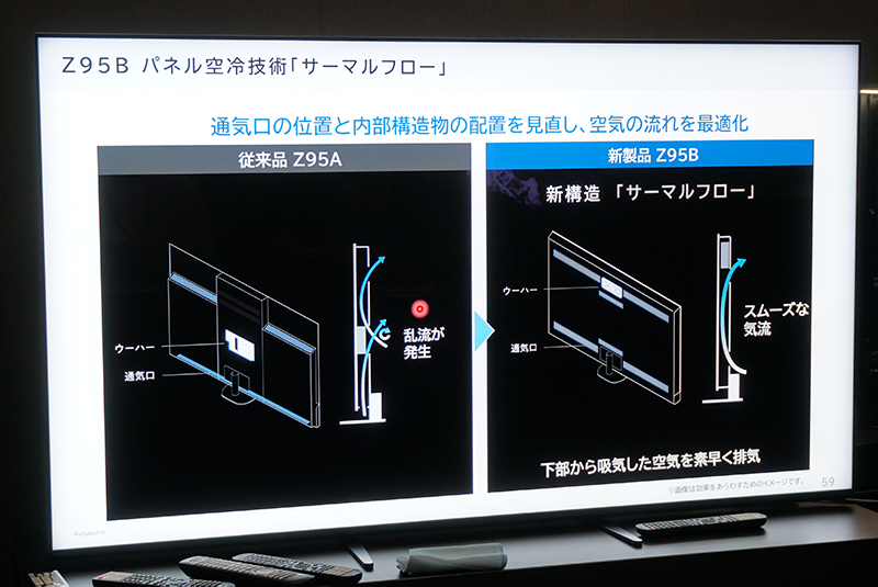 また、このプライマリーRGBタンデムの発光性能を最大限引き出すためには、パネルからの放熱を素早く逃がす放熱管理も重要であると同社は指摘。従来の独自素材を用いた貼り付け構造とバックカバー一体型放熱プレートを用いた独自構造から、刷新された新デザインによって実現した、独自の筐体内部構造を用いる特許出願中の新パネル空冷技術「サーマルフロー」を採用する。