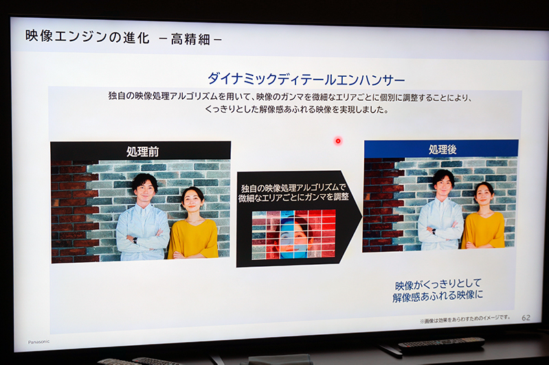 25年エンジンによる新機能としては、独自の映像処理アルゴリズムを用いた「ダイナミックディテールエンハンサー」を搭載。映像のガンマを微細なエリアごとに個別に調整してくれることで、よりクッキリとした解像感あふれる映像を表示できるとアピールする。
