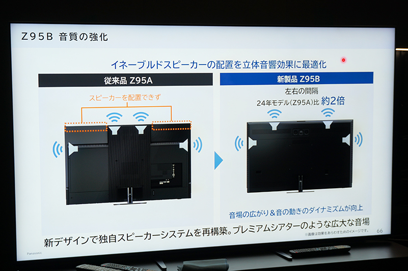サウンド面では、Z95Aシリーズの「360立体音響サウンドシステム+」をベースに、新スピーカーを採用した独自制御の大出力マルチスピーカーシステムを内蔵。新デザインによって上部に位置するイネーブルドスピーカーをより外に配置できるようになったことで、スピーカー同士の左右の間隔が前世代機の約2倍に増加した。