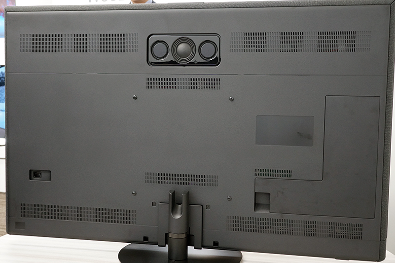 スピーカー構成は、多数のスピーカーを線上に並べて前向きの音を鳴らす新ラインアレイスピーカーに加えて、高さ方向の音を表現する新イネーブルドスピーカーを2基、横方向に広がるサウンドを鳴らす新ワイドスピーカーを2基、そして新ウーファーを1基搭載。さらにパッシブラジエーターは従来の2基から対向配置で計4基に増加させている。スピーカーの実用最大出力は65型が160Wから170W、55型が150Wから160Wに強化された。