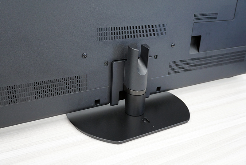 端子部分は着脱カバー備えるほか、電源ケーブルは着脱式を採用。スタンド底面の吸盤とテレビ台との間を真空に近い状態にするパナソニック独自の「転倒防止スタンド」、および首振りが可能なスイーベルも備えている。
