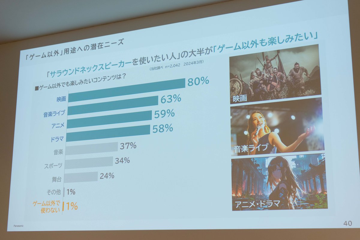 また同社調べによるアンケートを実施したところ、「サラウンドネックスピーカーを使いたい人」の大半が「ゲーム以外も楽しみたい」と考えており、映画や音楽ライブ、アニメ、ドラマといった、映像コンテンツの視聴でもサラウンドネックスピーカーを使用したいという意見が多かったことが、SC-GNW30の開発に繋がったと明かした。