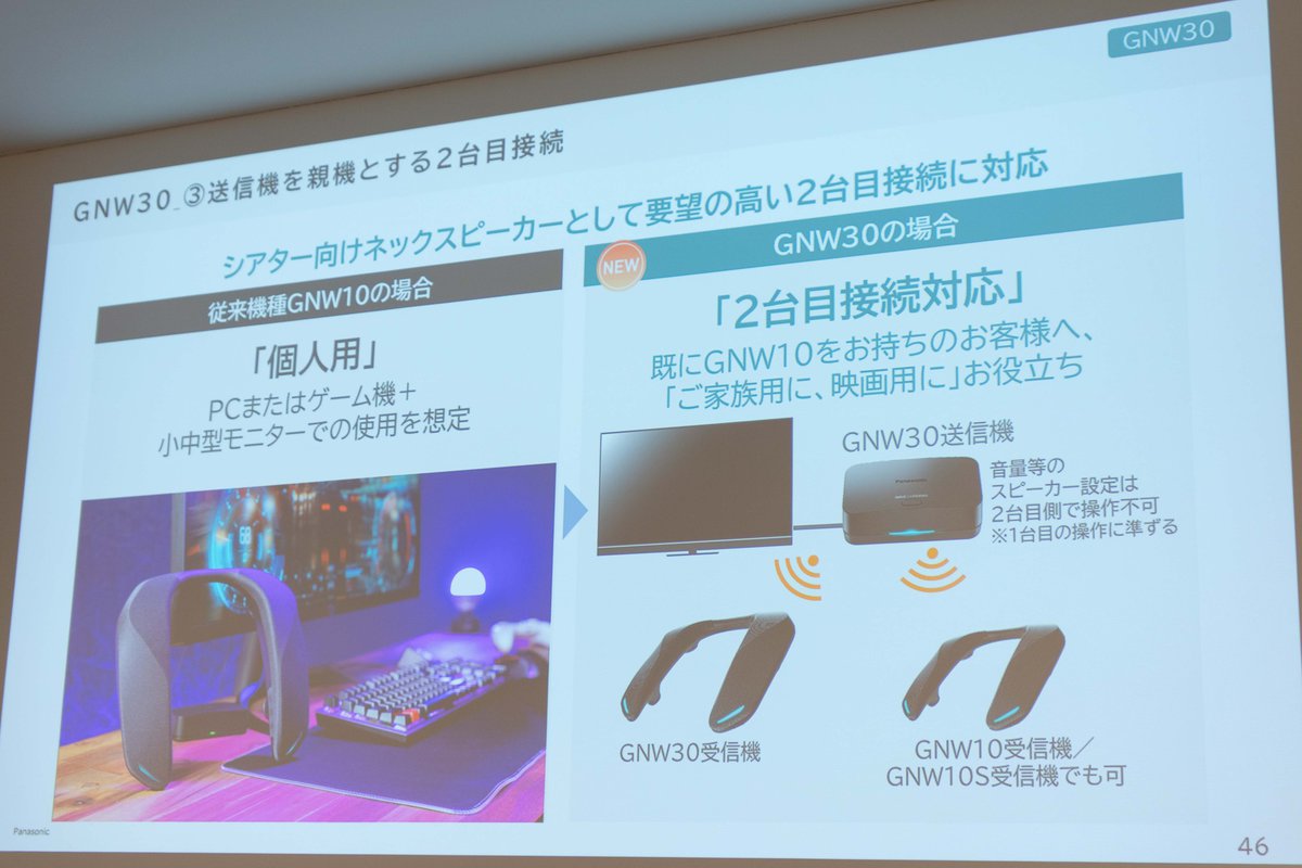 SC-GNW30は、ワイヤレス送信機が新たに2台目接続に対応したため、たとえばすでにSC-GNW10を持っているユーザーは、2台同時にワイヤレスネックスピーカーを使用することができる。音量などの調整は、1台目のみ操作可能となる。