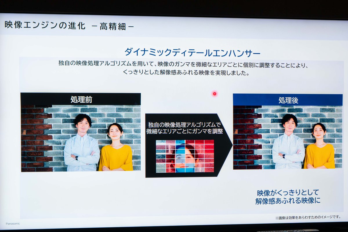 「ダイナミックディテールエンハンサー」は、独自の映像処理アルゴリズムを用いて、映像のガンマを微細なエリア毎に個別調整することによって、くっきりとした解像感に溢れる映像表現を可能としている。