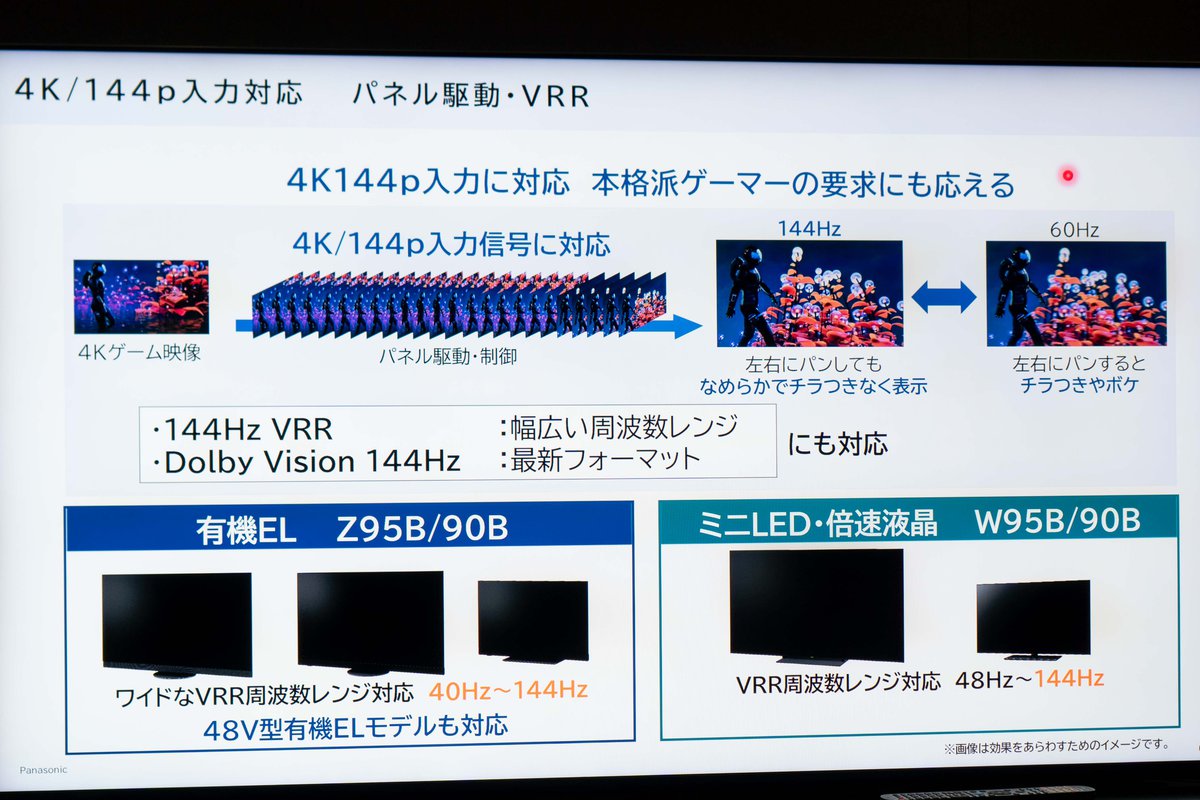 ゲーミング関連の機能では、W90Bシリーズのみ4K/144p入力信号に対応。144Hz VRRやDolby Vision 144Hz、VRR周波数レンジは48Hz – 144Hzもカバーする。
