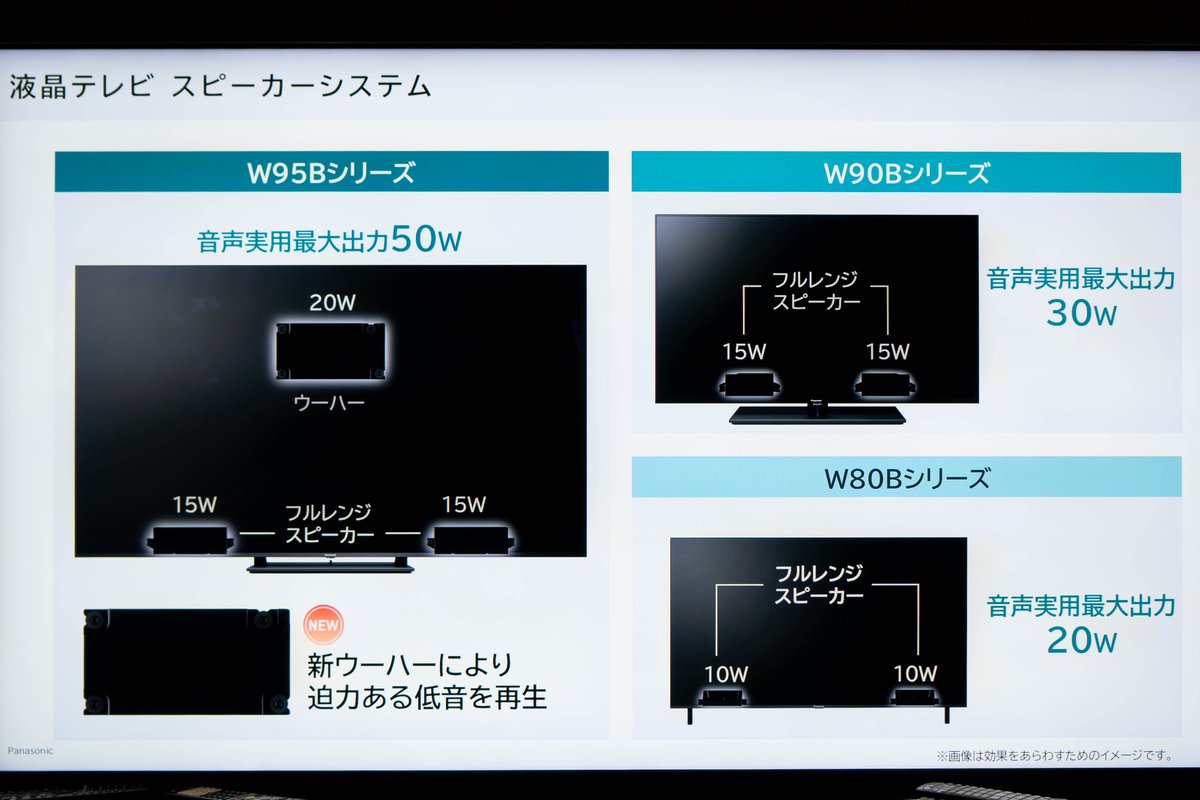 サウンド面は、W90Bシリーズがフルレンジスピーカーを2基搭載し、実用最大出力30W(15W×2)のアンプ、W80Bシリーズがフルレンジスピーカーを2基、実用最大出力20W(10W×2)のアンプを搭載している。立体音響フォーマットはDolby Atmosに対応している。