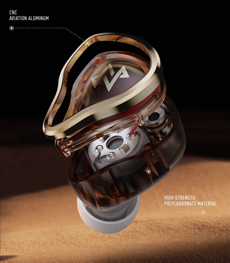 ハウジングは、外耳道の角度、空洞の角度、ワイヤーの角度などを研究し、より多くの人の耳にフィットする形状へと見直しを図った。素材には軽量かつ高強度なポリカーボネートと、高級感を兼ね備えるCNC航空グレードアルミニウムを採用。懐かしさと暖かみを感じさせるメイラードカラー(褐色)を採用する。