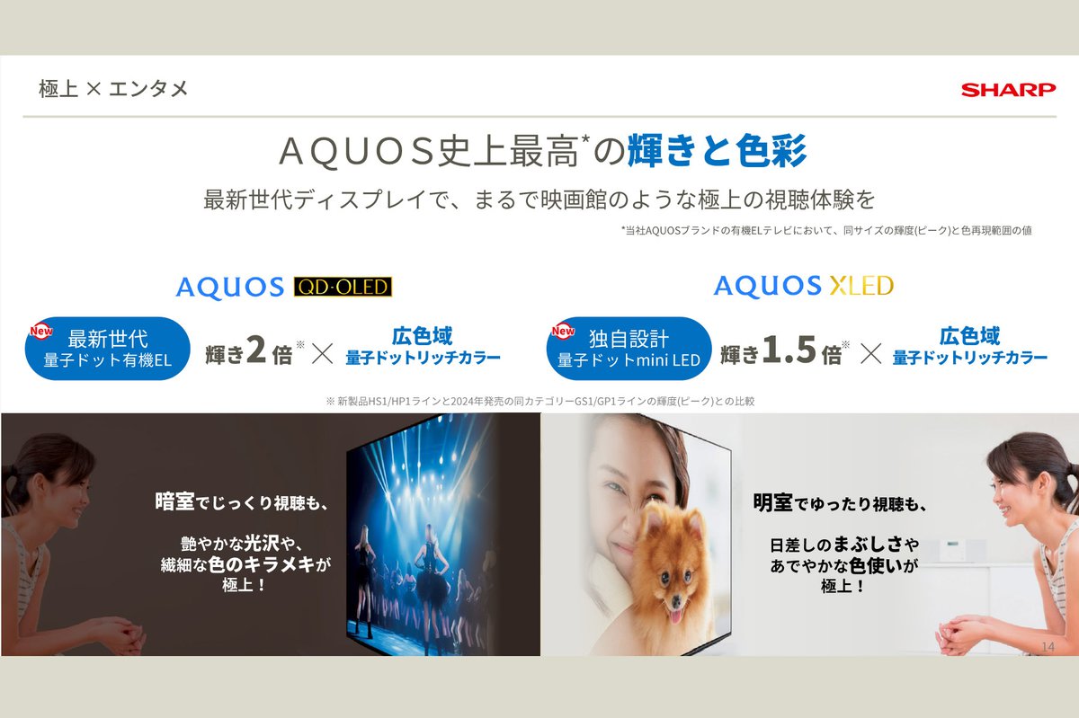 HP1/HP2ラインは、2024年度の “GP1/GP2ライン”の後継機種であり、AQUOS XLEDのラインナップで上位シリーズに位置付けられているモデル。後述する機能強化によって「AQUOS史上最高の輝きと省エネ性能を兼ね備えた4K Mini LED液晶テレビ」になったと同社は説明している。