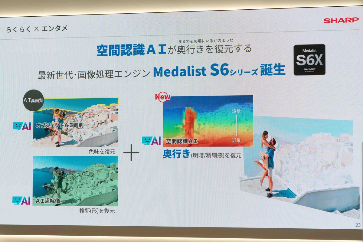 最新世代「Medalist S6X」ならではのトピックが「空間認識AI」の投入だ。映像コンテンツ内の各被写体の位置・前後関係をAIが認識して、それぞれの被写体の位置に応じた最適なチューニングを施すことで、近い被写体はくっきりと見やすく、遠くの風景や建物などは自然な再現にすることで、今まで以上に奥行き感や立体感に優れた映像再現が可能だとアピールした。