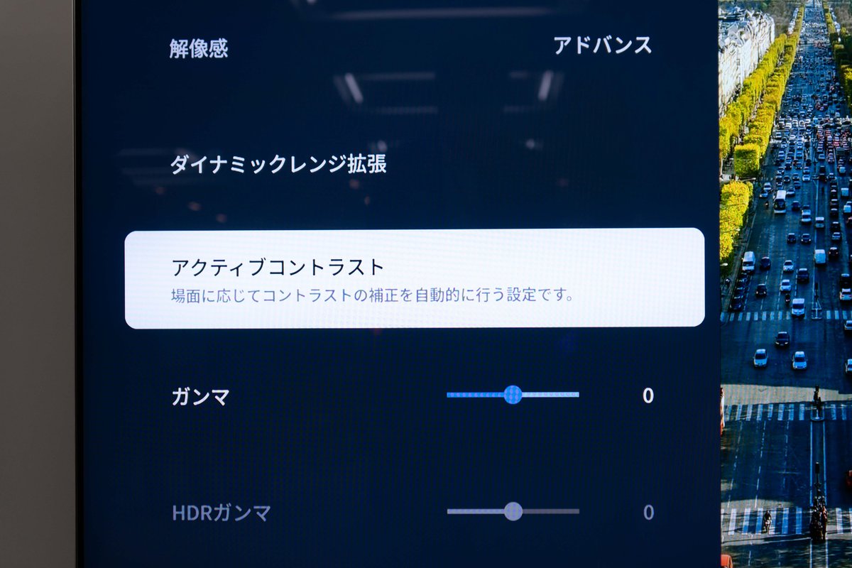 「空間認識AI」に関連している映像調整項目「アクティブコントラスト」の設定は、従来まで入/切を選択できるだけだったが、2025年度モデルから「AI」の項目が追加されるかたちとなった。