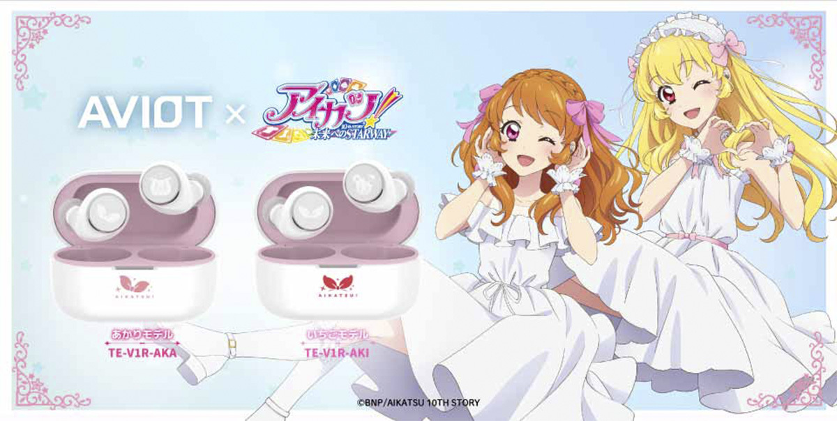 AVIOTの完全ワイヤレスイヤホン「TE-V1R」をベースとした、アニメ『アイカツ!』とのコラーボレーションモデル。本作をモチーフとした本体デザインやパッケージを採用し、キャラクターの完全新録ボイスを搭載した特別仕様となっており、それぞれデザインや収録ボイスの異なるTE-V1R-AKA(あかりモデル)とTE-V1R-AKI(いちごモデル)の2種類を展開する。