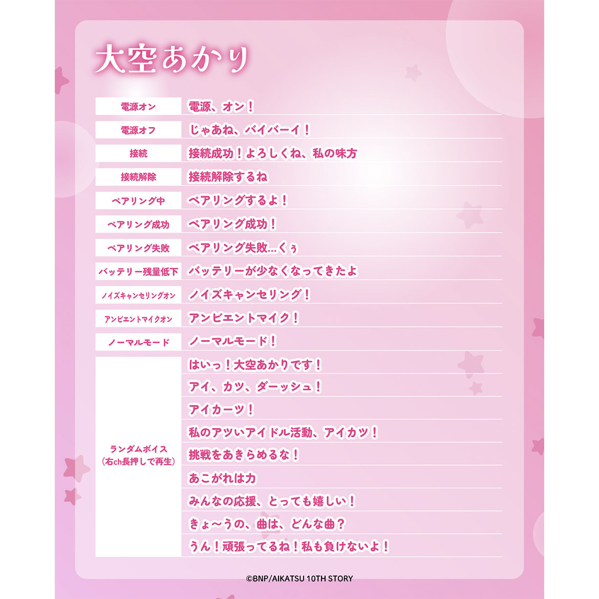 モデル名になっている大空あかりと星宮いちごを含む、作中に登場するキャラクター28名(※各モデル14名ずつ)、合計560種類以上のスペシャルボイスを完全新規録り下ろしで収録。イヤホンのオン/オフや接続状況を通知する「ボイスガイダンス」に加え、好きなタイミングで聴ける「ランダムボイス」で楽しむことができる。