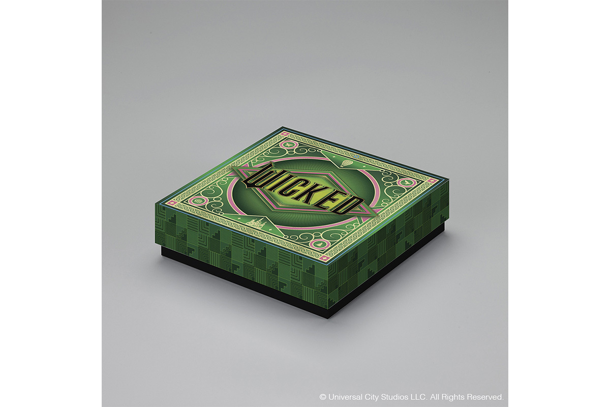 通常モデルのスタイリッシュさをそのままに、映画の世界観を凝縮した特別デザインを採用。本体の表面、窓枠のフレームにはエメラルドシティーと気球がゴールドで縁どられている。その下のボディ部分には「WICKED」の文字の両端にエルファバとグリンダの横顔をレイアウト。背面には2人が手を取り合うシルエットを刻印。パッケージはエメラルド城のレリーフが鮮やかな色彩で描かれている。