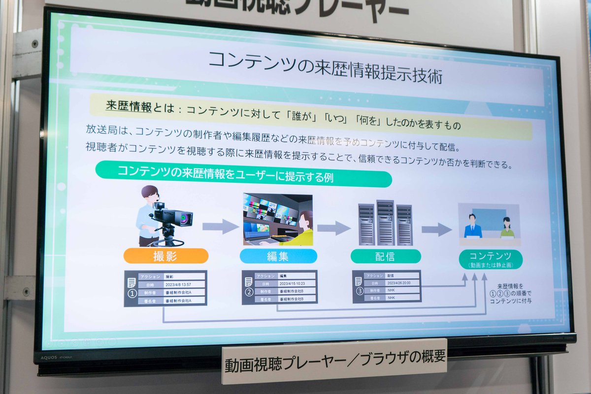 「来歴情報提供技術」の展示ブースでは、視聴動画の来歴情報や改ざんの痕跡をリアルタイムで表示する技術を紹介。視聴者は映像の信頼性を判断可能となり、偽情報/誤情報に接触するリスクを低減できる。