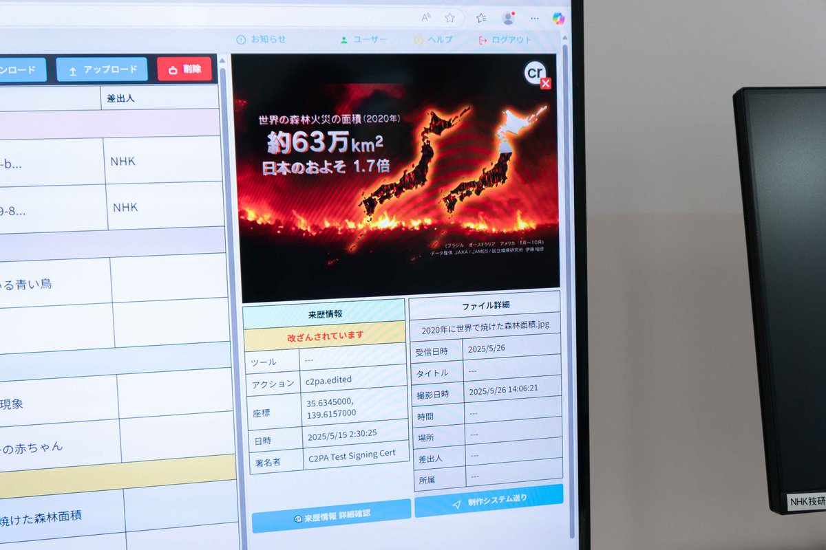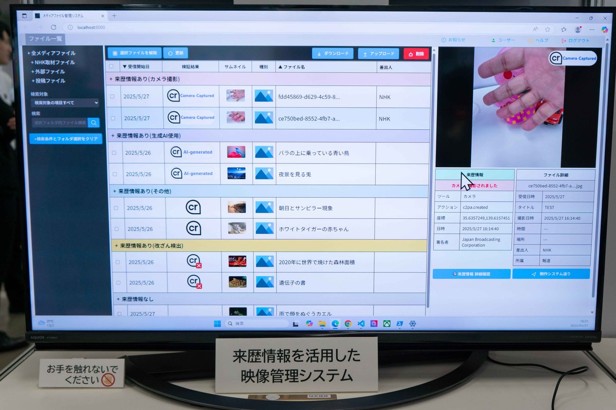 近年の映像制作現場では、視聴者から映像素材の提供を受ける機会が増えていることから、膨大な映像素材の出どころや真正性を来歴情報により自動判別する、コンテンツ制作現場向けのシステムも試作している。