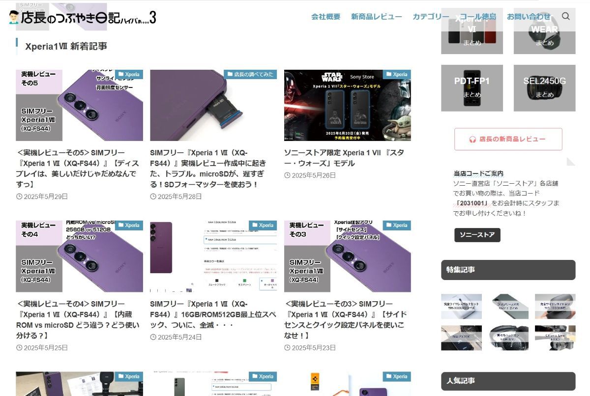 さらに、気になるテーマごとにスポットを当てた5本の「実機レビュー」など、実に30本近い記事を立て続けに掲載。「店長のつぶやき日記ハイパぁー…3/Xperia 1 VIIまとめ記事」を是非チェックしてほしい。