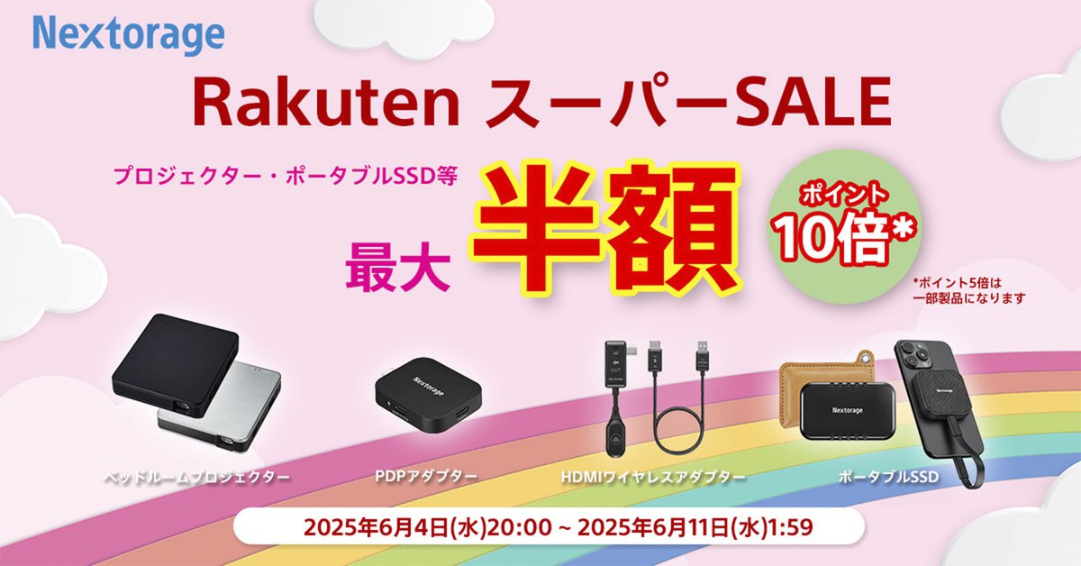 Nextorageは、本日6月4日 20時より開催される楽天スーパーSALEにて、映像関連機器やスマホ周辺機器を大幅な割引価格で販売するセールを実施。