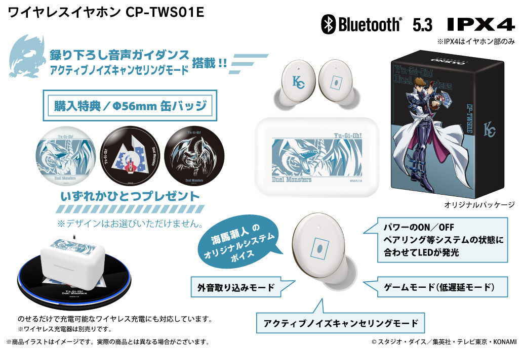 『遊☆戯☆王デュエルモンスターズ』の25周年を記念したコラボモデルで、完全ワイヤレス「CP-TWS01E」をベースに海馬瀬人をモチーフとした仕様を搭載。左右ハウジングには海馬瀬人を象徴するアイコンを、ケース天面には青眼の白龍(ブルーアイズ・ホワイト・ドラゴン)をデザインする。