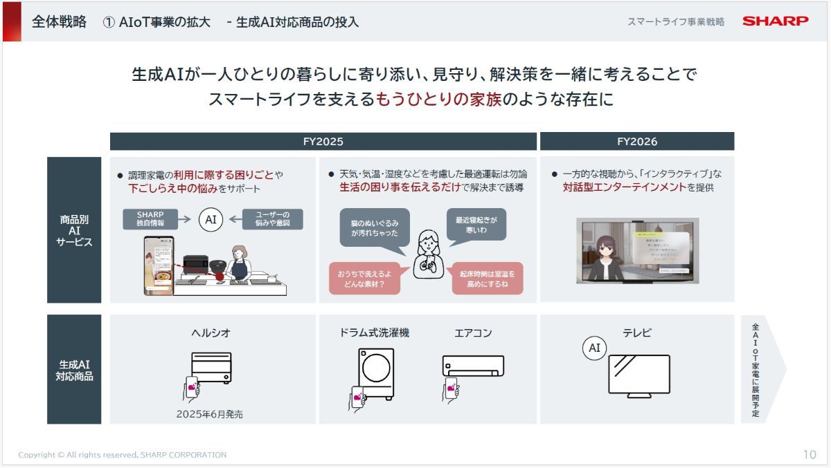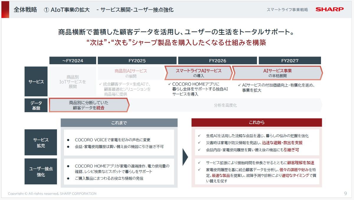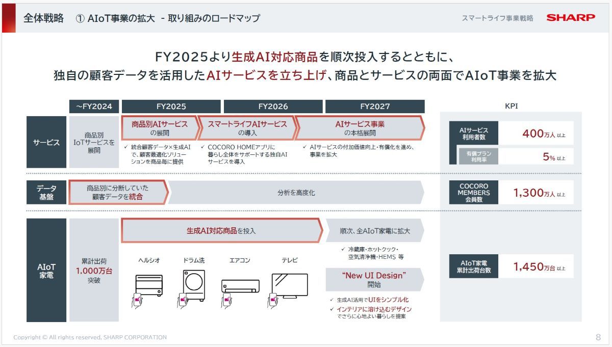 KPIとして、独自の顧客データを活用したAIサービス利用者数400万人以上(うち有償プラン利用率5%以上)、COCORO MEMBERS会員数1,300万人以上、AIoT家電累計出荷台数1,450万台以上とし、商品とサービスの両面からAIoT事業を拡大する。
