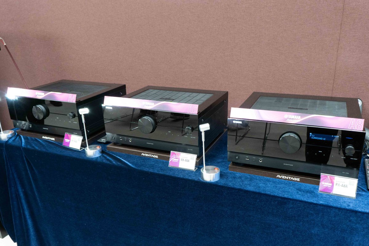 AVアンプの最上位「RX-A8A」やワイヤレスシアターヘッドホン「YH-L700A」も並ぶ