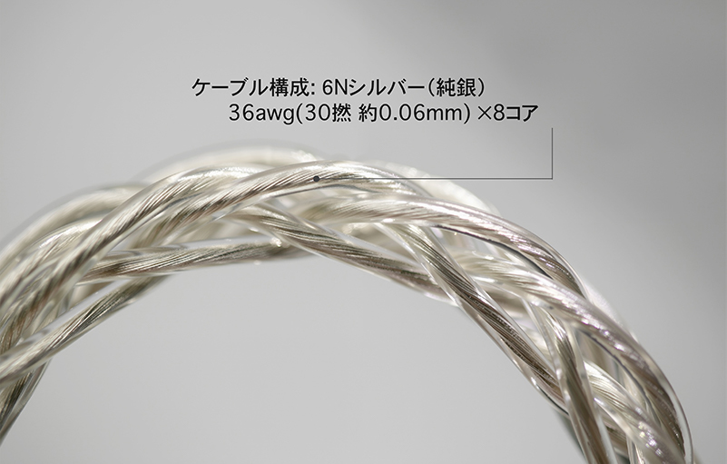 線材部分は、約0.06mmの6N純銀線を30撚りした、36awg×8コア構成を採用する。これにより、純銀線らしい煌びやかな高域が楽しめるとアピールしている。外径は1.0mmで、外皮にはデュポン製PVCを用いている。