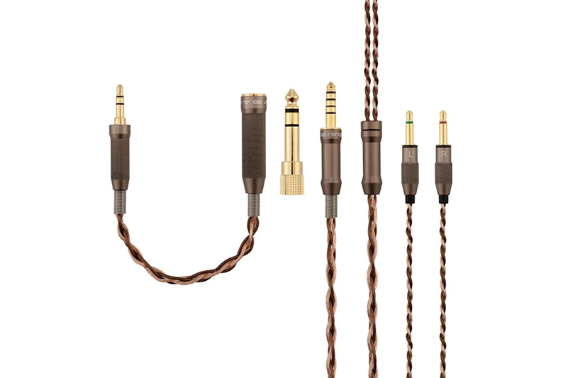 ケーブルは、6N OCC (単結晶無酸素銅) 高純度仕様の4.4mmバランスケーブルを付属。音質劣化を最小限に抑え、ヘッドホンのポテンシャルを最大限に引き出すと謳う。ケーブ長は2m。3.5mm 2極プラグ×2によるケーブルの着脱に対応する。6.35mm to 3.5mm、3.5mm to 4.4mmの変換プラグも同梱する。