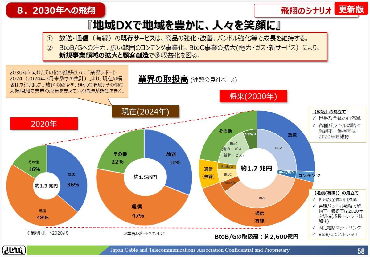 8章「2030年の飛翔」では、そのシナリオにおいて、既存サービスの「放送」「通信(有線)」、さらに「その他」の3つのカテゴリーのなかから、「その他」を約30%にまで引き上げることを目標としているが、こちらも現時点において、BtoB/BtoG事業への取り組み強化、BtoC事業では電力/ガス/新サービスを拡大するなど、「順調に進捗している」とのこと。