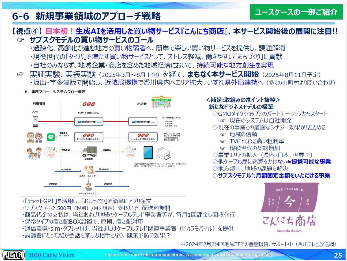 このうち、「新規事業領域へのアプローチ戦略」のユースケースのひとつとして香川テレビ放送網による日本初の生成AIを活用した買い物サービス「こんにち商店」を紹介した。チャットGPTを活用し、“おしゃべり” で簡単にアプリ注文ができるサービス。サブスクで配送料は無料。ケーブルテレビ事業者等が通信環境やタブレットを提供し、代金の回収を代行する。