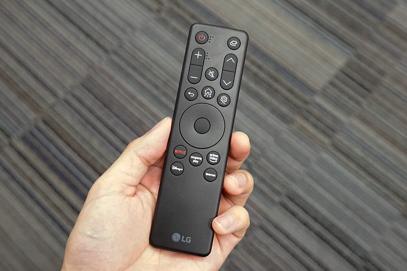 前モデルCineBeam Qでは「リモコン操作がしづらい」といった声があったことを受けて、本機では専用リモコンも再設計された。同シリーズの他リモコンと比べてサイズがスリム化され、より直感的な操作が可能になったとのこと。外観面ではマットブラックの洗練されたデザインを採用している。