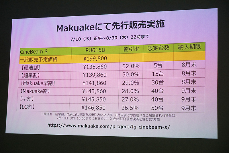 Makuakeでの先行販売は、7月1日(木)正午から8月30日(木)22時まで実施。先行販売ではオフ率と販売台数がそれぞれ異なる6つのプランが用意されており、上述の通り、もっともオフ率の高い「最速割」は5台限定で、32%オフの税込149,446円で購入できる。
