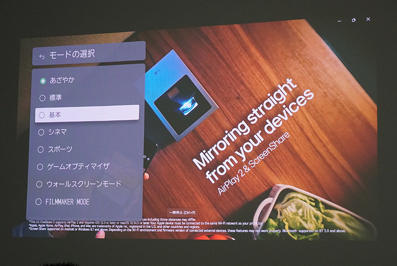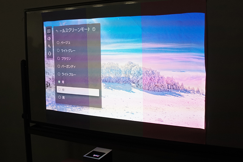 また、ベージュ、ライトグレー、ブラウン、バーガンディ、ライトブルー、青、緑、黒の8色の中から、壁色にあわせて映像の色を調整できる「ウォールスクリーンモード」を新たに搭載する。これにより、真っ白な壁やスクリーンに投影できない場合でも、自然な色での映像鑑賞が可能になるという。