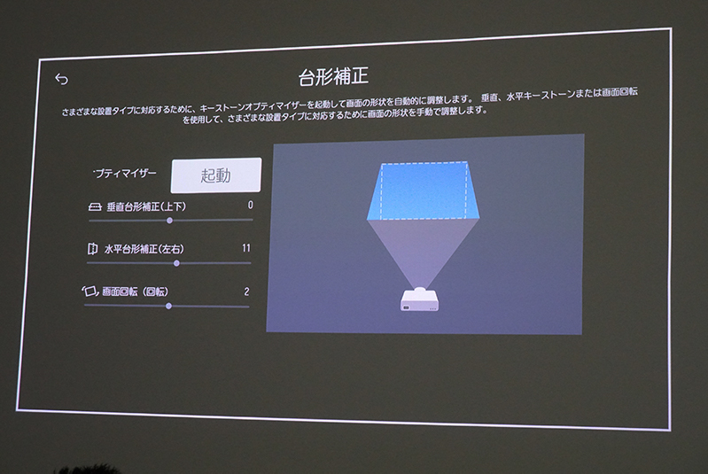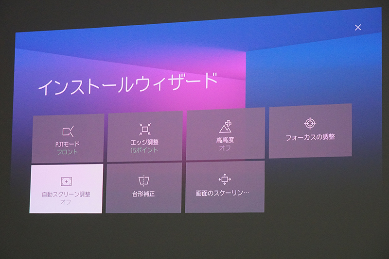 各種調整機能を備える「インストールウィザード」も搭載しており、メニュー画面から画面にあわせて映像を正確な形状で表示させる「エッジ調整」や、キーストーンオプティマイザーを起動して画面形状を自動的に調整する「台形補正」機能、自動でスクリーン調整を行う「自動スクリーン調整」機能などを起動できる。