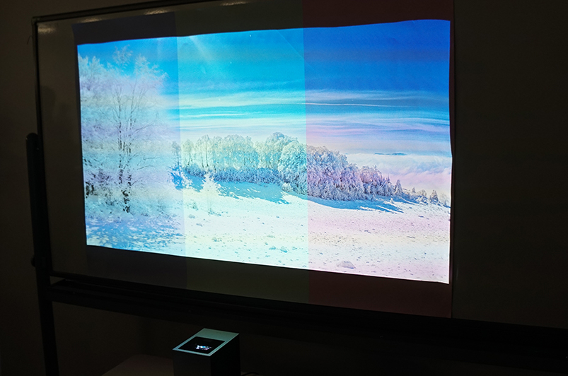 安藤氏は、自宅の壁が必ずしも白であるとは限らないとして、「壁によっては木目調であったり、緑がかった、青がかった風合いの壁も見受けられる。本モードを活用すればその壁の色ごとに合った映像調整が行える」とアピールした。