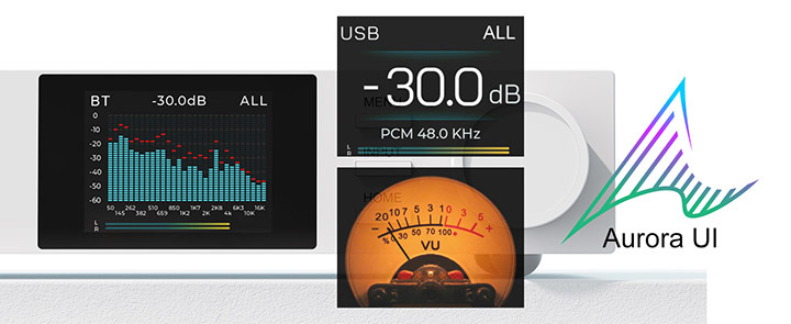 前面には2.0型のフルカラースクリーン、3つの物理ボタン、押し込み操作対応のノブを配置。カラフルでレスポンスのよいインターフェース「Aurora UI」で直感的な設定変更やカスタマイズが可能だとする。UIのメインカラーは9色から好みにあわせて選択でき、またVUメーターやFFTといった視覚効果で音楽再生を盛り上げることもできる。